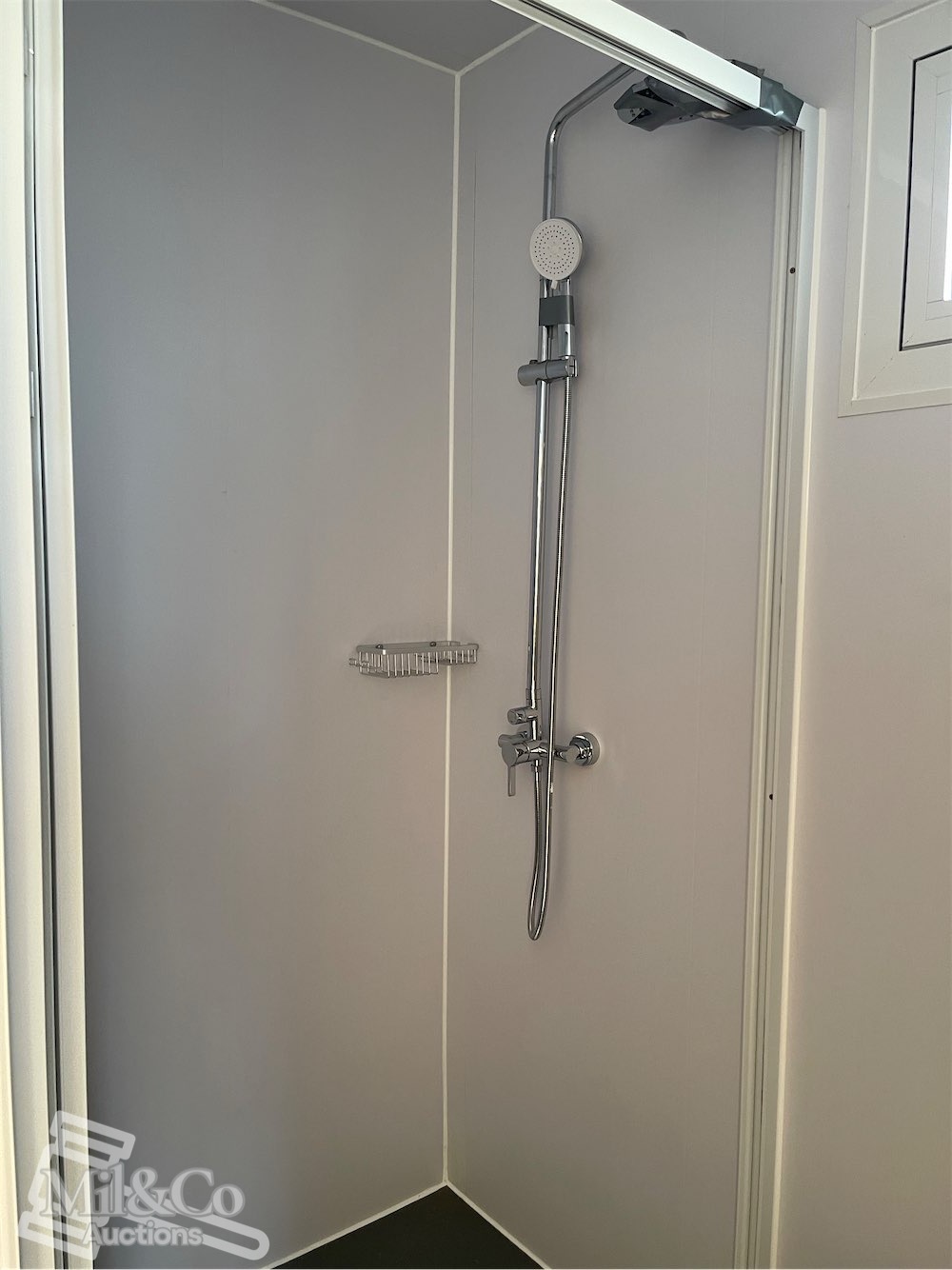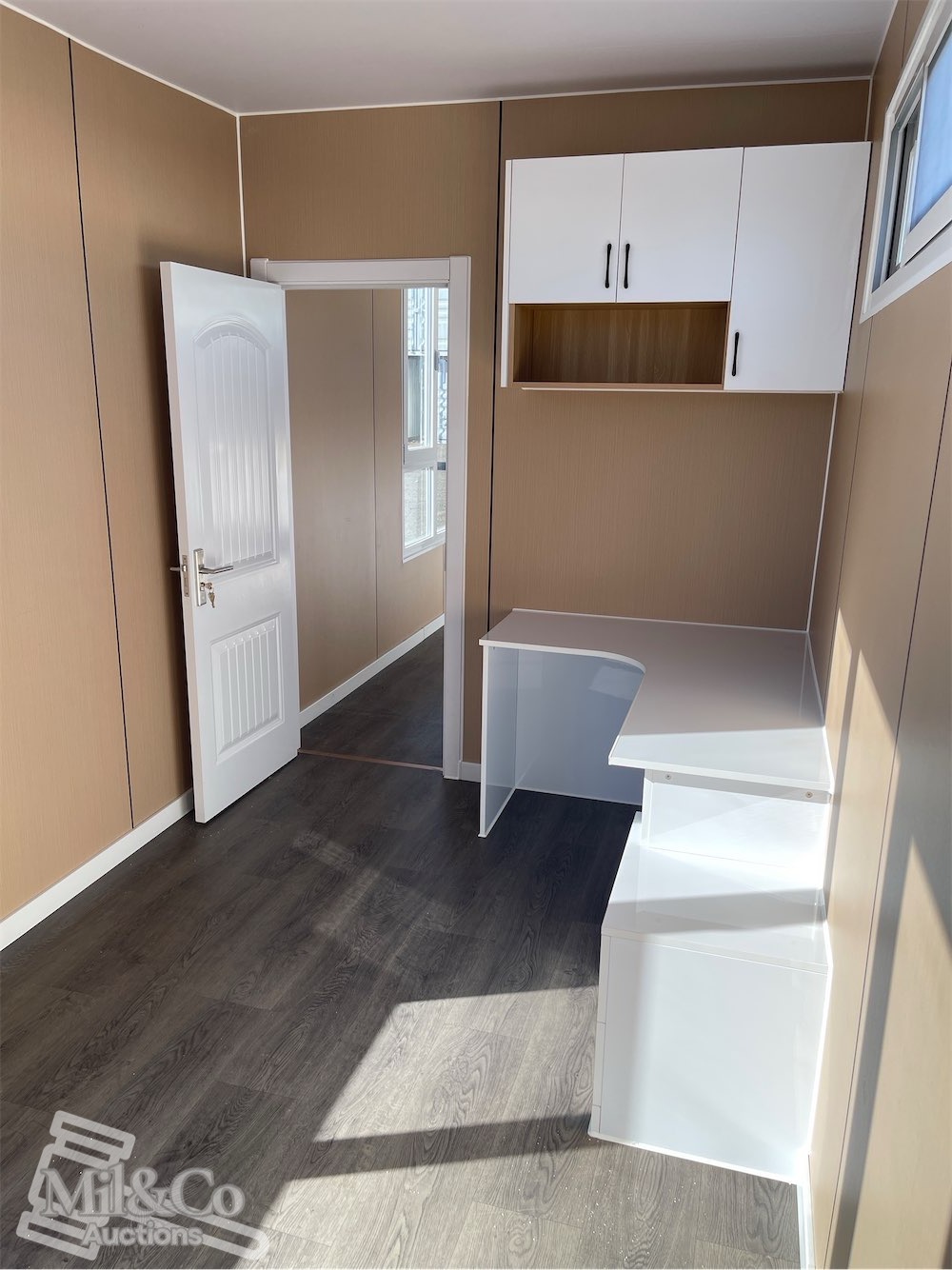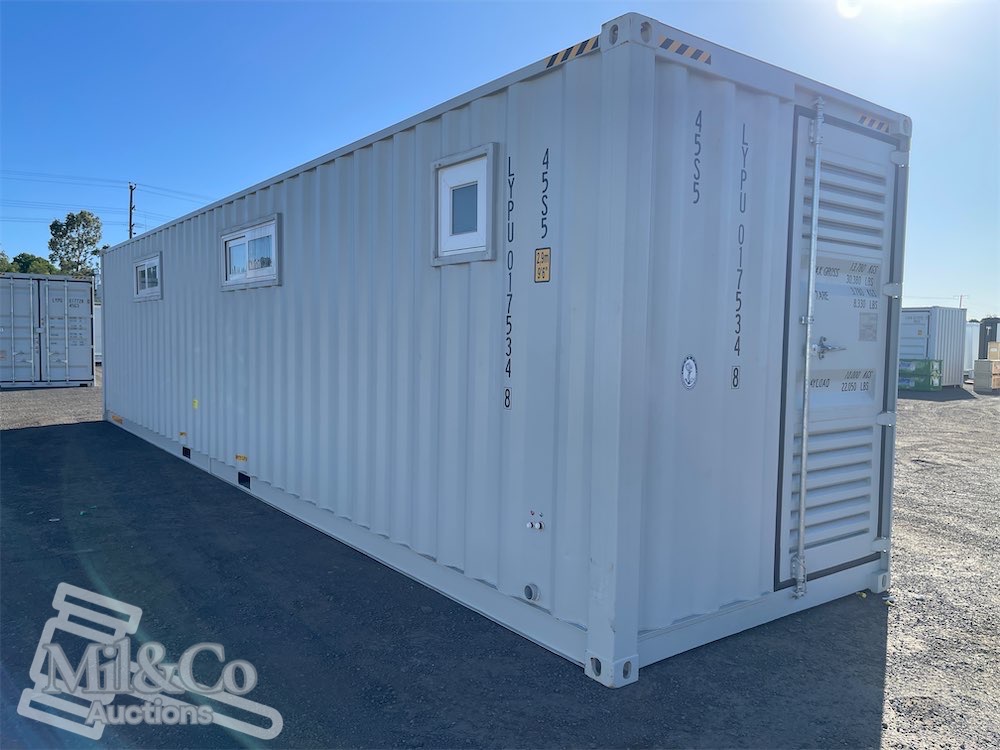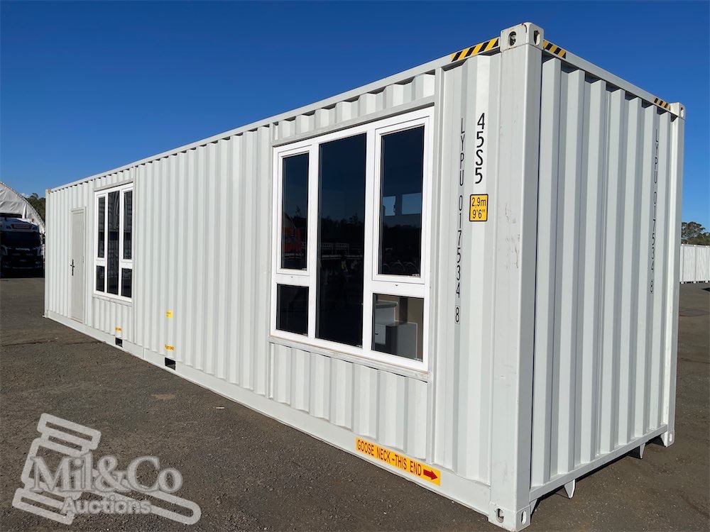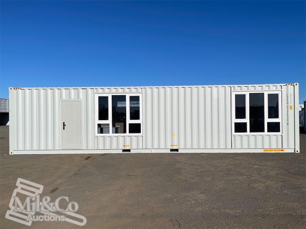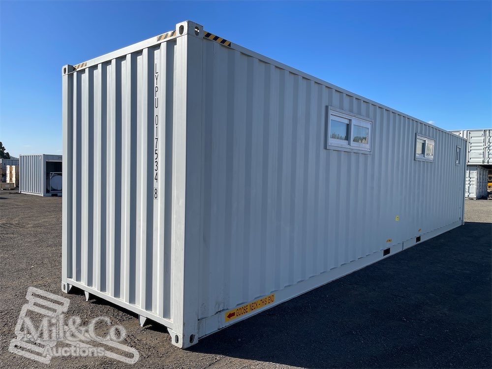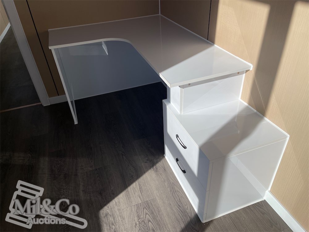 40ft High Cube Shipping Container fitted Kitchen / living area & Bedroom fitted with Shower & Toilet & Vanity & Kitchenette with sink, Insulated walls, Large Front Windows, Wardrobe, Desk, Fold away Table & Various cabinets